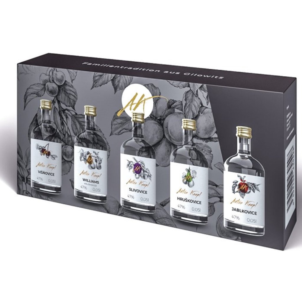 Luxusní dárková balení tzv. klapboxy z tvrdého papíru tloušťky 1,4 mm s ofsetovým barevným tiskem a matnou laminací naplněné lahvemi s naším kvalitním destilátem.