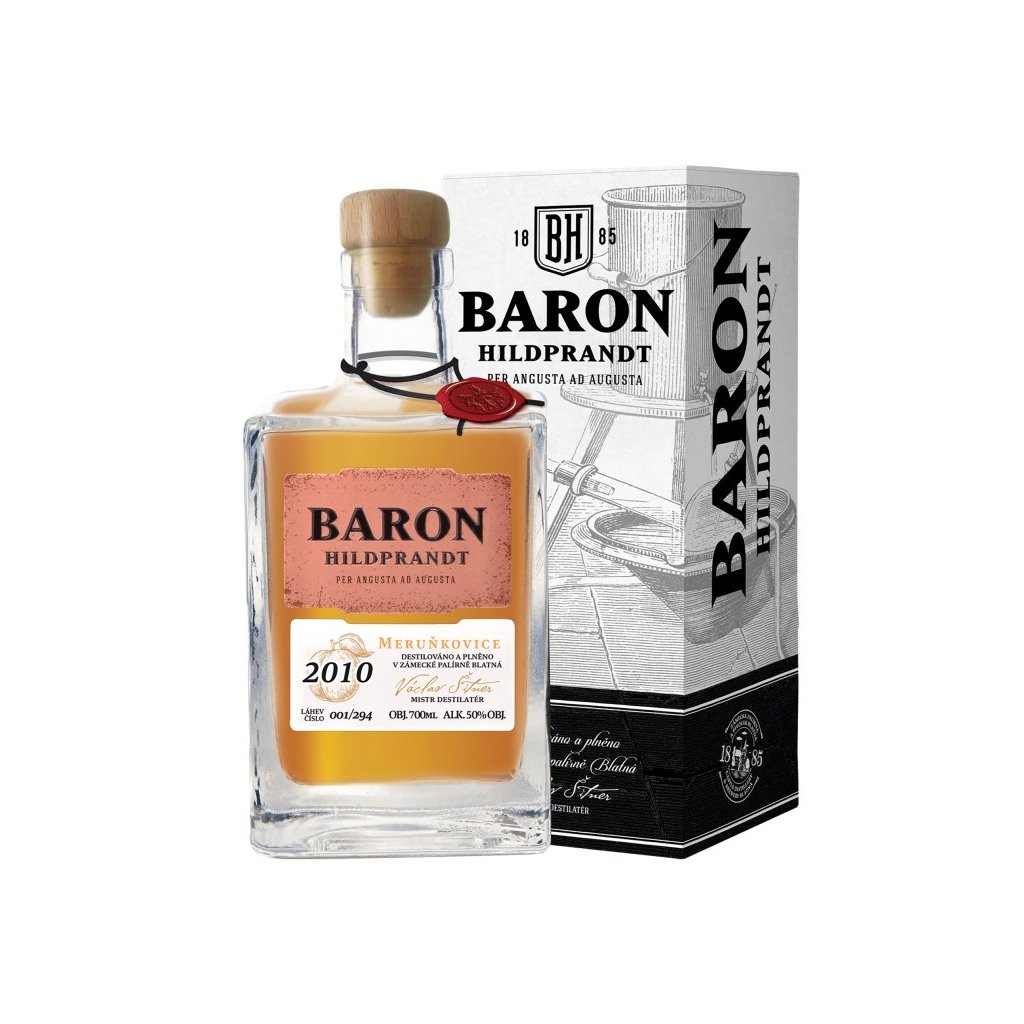 Prvotřídní ovocná pálenka Baron Hildprandt Meruňkovice 50 % je vyrobena z výběrových meruněk z jižních Čech. Ruční rodinná malovýroba je zárukou výjimečnosti a díky trojnásobné destilaci jsou odstraněny všechny nežádoucí látky způsobující nevítané chutě či vůně. Opakovaná destilace naopak zintenzivňuje a zušlechťuje meruňkovou chuť pálenky a díky trojímu provedení si stále uchovává 50 % obsahu alkoholu. Ultra jemný a čistý destilát, který zraje 1 rok ve smaltovaných tancích, tak bude pokaždé unikátním zážitkem s žádoucím silným efektem. Vychutnejte si ultra jemnou a čistou meruňkovici, na které pracují ti nejlepší odborníci ze zámecké palírny Blatná.